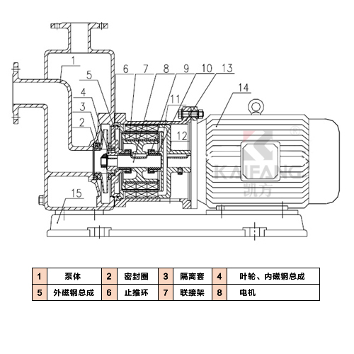 1.泵軸由動密封變成封閉式靜密封,徹底避免了介質(zhì)泄漏。2.無需獨(dú)立潤滑和冷卻水,降低了能耗。3.由聯(lián)軸器傳動變成同步拖動,不存在接觸和摩擦。功耗小、效率高,且具有阻尼減振作用,減少了電動機(jī)振動對泵的影響和泵發(fā)生氣蝕振動時對電動機(jī)的影響。4.過載時,內(nèi)、外磁轉(zhuǎn)子相對滑脫,對電機(jī)、泵有保護(hù)作用。